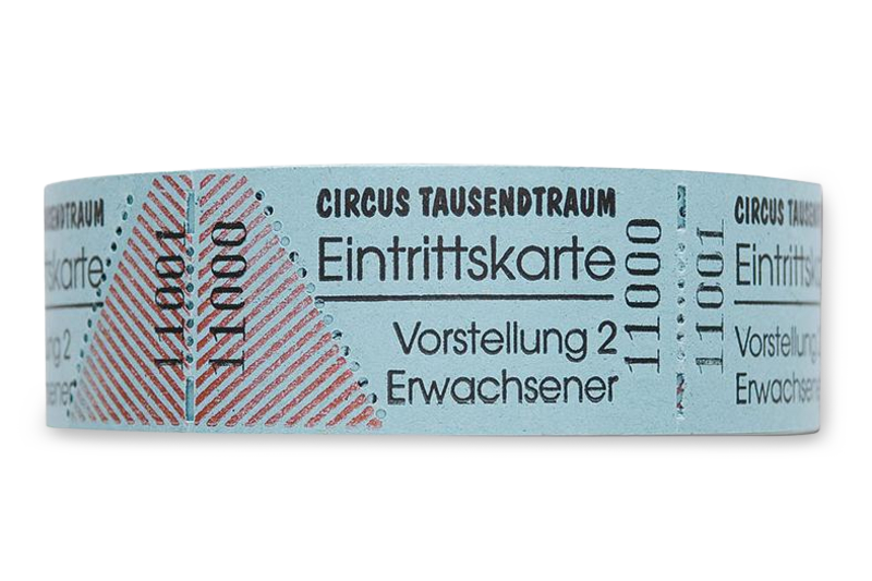 Die solide Abriss-Eintrittskarte für deine reibungslose Einlasskontrolle in Ausstellungen, im Schwimmbad, Zirkus oder Kino. Mit einer fortlaufenden Nummerierung für eine rasche Abrechnung und schnelles Ermitteln der Besucherzahl bei Veranstaltungen aller Art.
