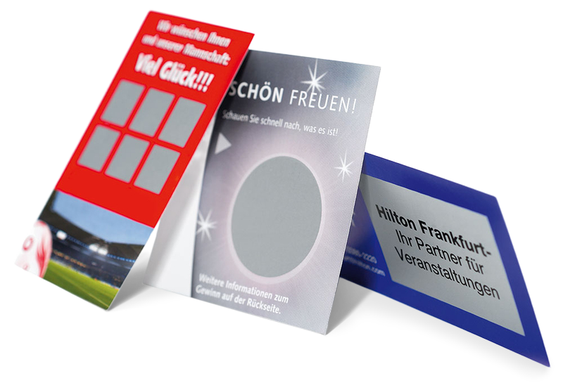 Gestalten Sie, wie es Ihnen gefällt und setzen Sie Ihre ganz individuelle bedruckte und unverwechselbare Rubbelkarte für dialogorientierte Marketingmaßnahmen, wie z. B. Rabattaktionen oder Gewinnspiele ein. Ihren kreativen Ideen und Anforderungen sind beinahe keine Grenzen gesetzt.