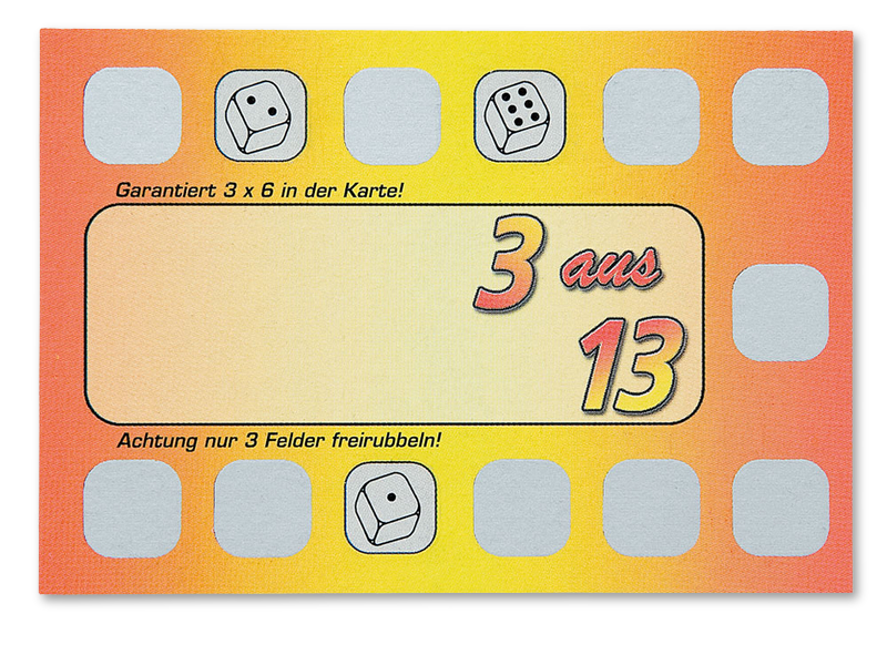 Bestelle Rubbellose kostengünstig und schnell in einem unserer 3 Standardformate oder komplett frei gestaltet. Für Kleinauflagen unter 1.000 Stück empfehlen wir unsere vorgefertigten Rubbellosspiele. Diese sind kurzfristig lieferbar und unschlagbar günstig.